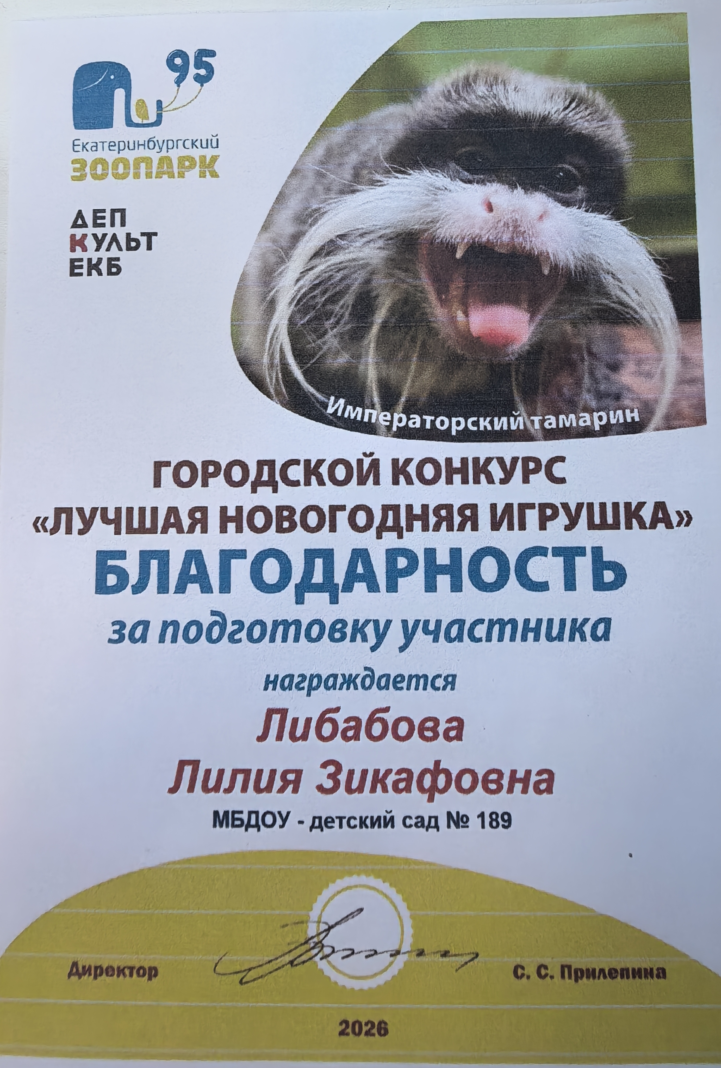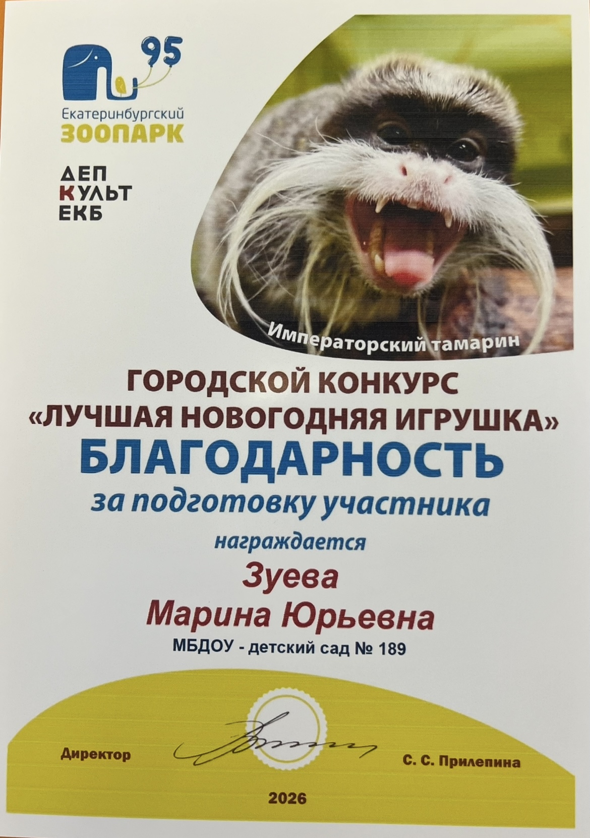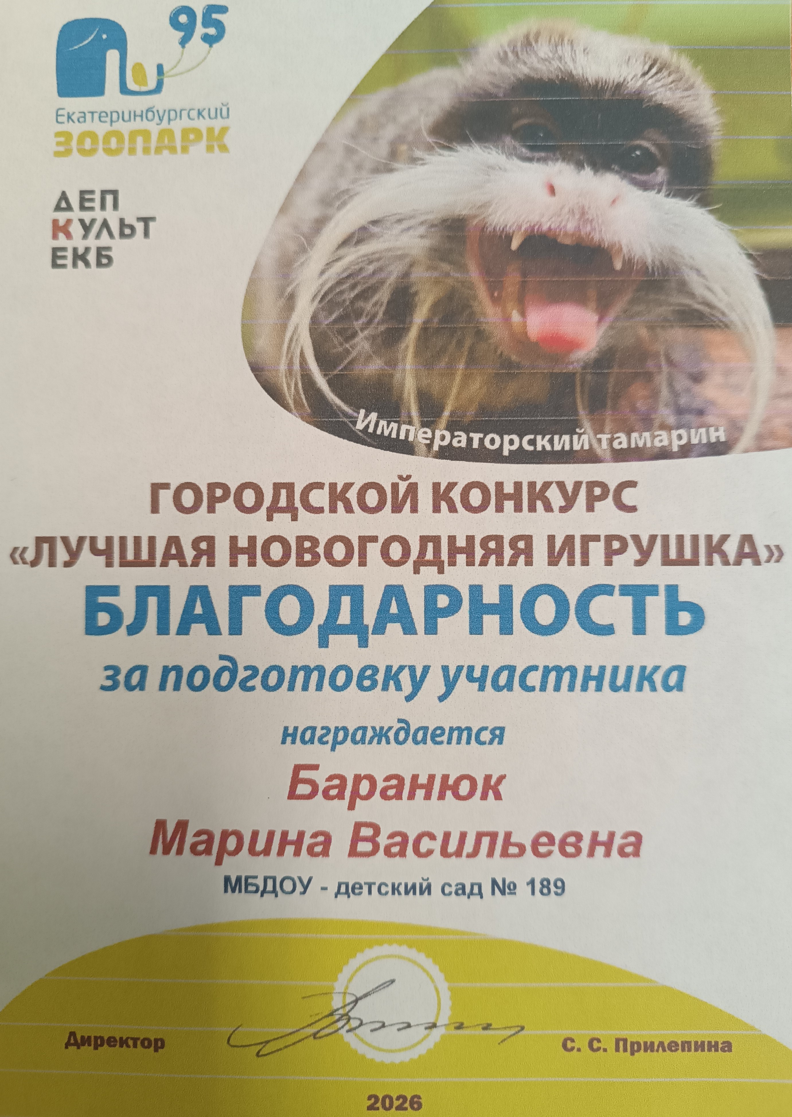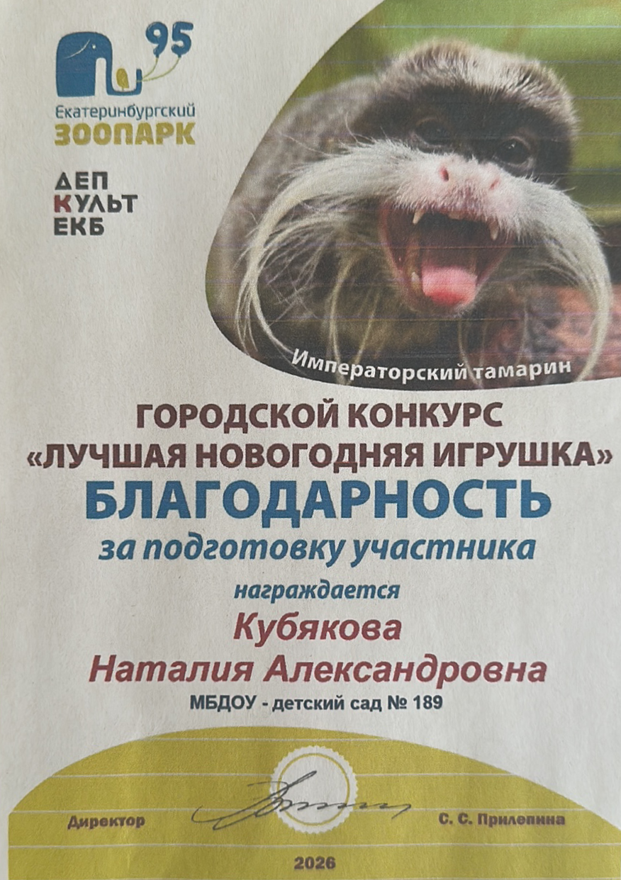 В данном конкурсе поучаствовали дети из четырех групп, 12 человек. Вместе со своими родителями дети создали новогодние игрушки зверей, птиц, млекопитающих, которые живут в Екатеринбургском зоопарке. Кураторами данного конкурса стали воспитатели групп: Кубякова Н.А., Либабова Л.З., Зуева М.Ю., Баранюк М.В.