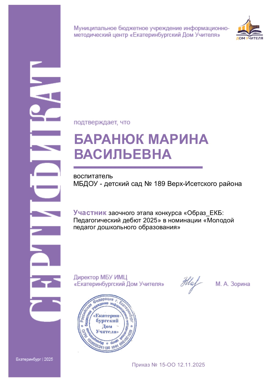 Марина Васильевна Баранюк, воспитатель участвует в данном конкурсе в номинации «Молодой педагог дошкольного образования». Поддержим ее и пожелаем ей успехов в профессиональном конкурсе!!!