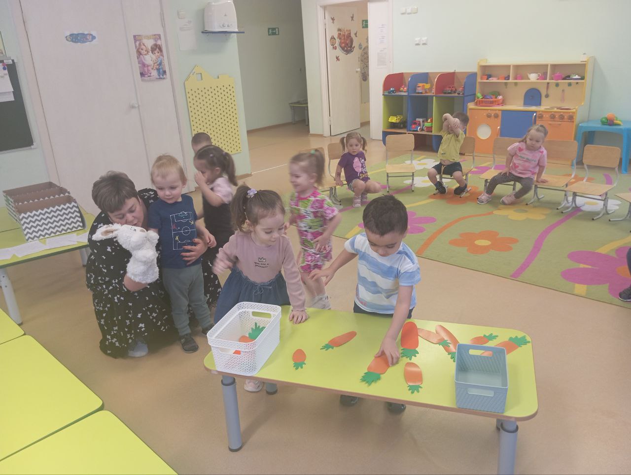 Занятие для малышей прошло в игровой форме, к деткам пришёл Зайчик и давал им разные задания: собери кубики так, чтобы каждый очутился в своем домике - цвете, разложи морковки по корзинкам по размерам: большие и маленькие. Дети с большим удовольствием выполняли задания и делали гимнастику при этом повторяли разные упражнения.