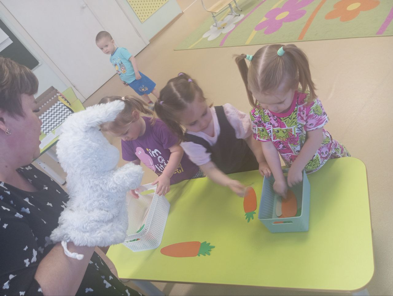 Занятие для малышей прошло в игровой форме, к деткам пришёл Зайчик и давал им разные задания: собери кубики так, чтобы каждый очутился в своем домике - цвете, разложи морковки по корзинкам по размерам: большие и маленькие. Дети с большим удовольствием выполняли задания и делали гимнастику при этом повторяли разные упражнения.