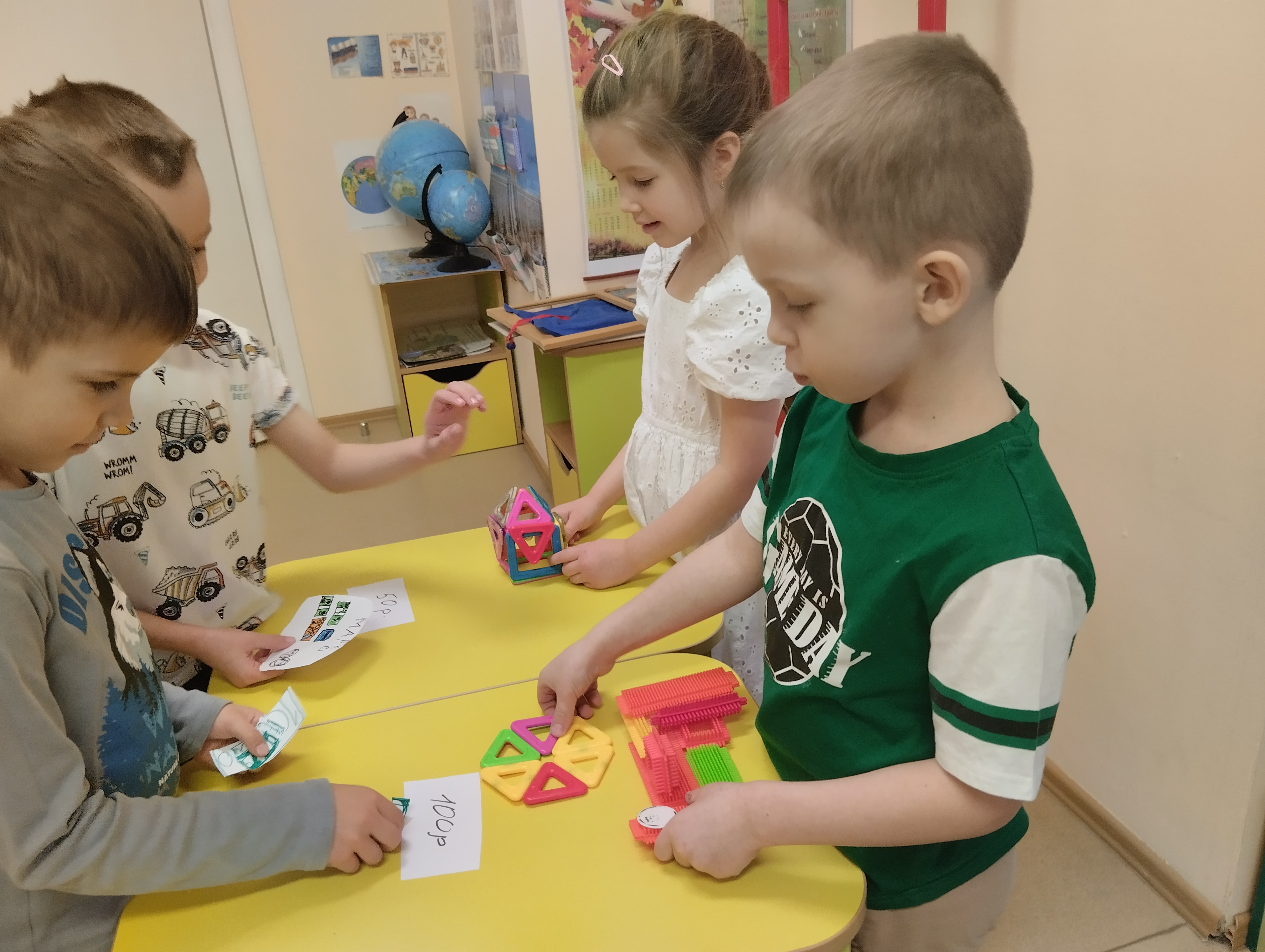 Анастасия Сергеевна, воспитатель, в начале проекта познакомила детей с понятиями "заработная плата", "труд", "денежные знаки", "мастерство", "доход". Ребята рисовали свои денежные знаки, затем создавали продукт из разного вида конструктора, а затем учились покупать и продавать товар в различных сюжетно-ролевых играх. Итогом проекта можно назвать мысли детей вслух "Нужно бережно относиться к зарплате, экономить, тратить только на полезные вещи, откладывать на будущее и т.д."